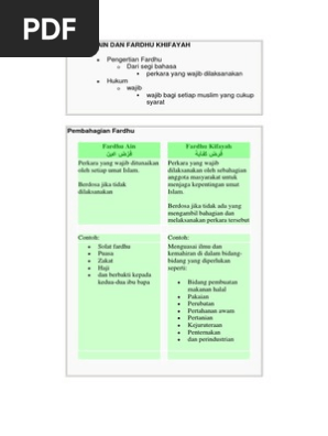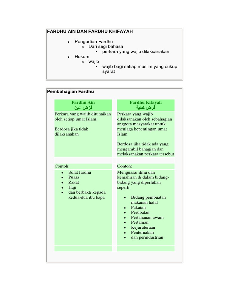 Fardu Kifayah perlu dibandingkan dengan Fardu Ain yang merupakan perintah Allah adalah wajib untuk di lakukan oleh setiap orang Islam samaada lelaki dan perempuanJika tidak ditunaikan maka berdosa. 20 PERNYATAAN MASALAH Ibadah khusus. فرض كفاية adalah status hukum dari sebuah aktivitas dalam Islam yang wajib dilakukan tetapi bila sudah dilakukan oleh muslim yang lain maka kewajiban ini gugur.